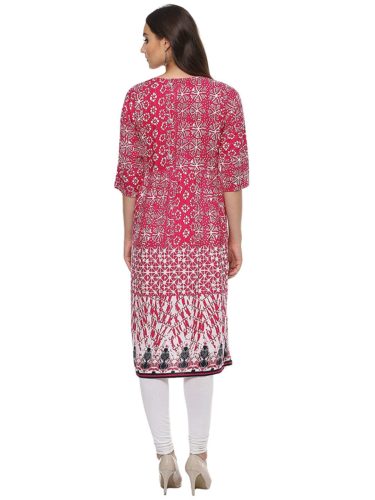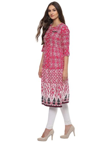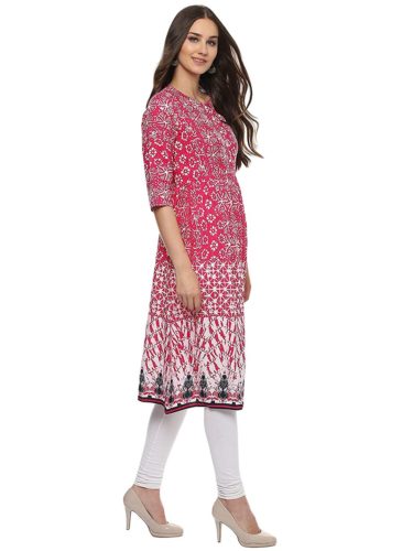 This Pink colour A-Line kurti, tailored in regular fit is made up of Rayon fabric suitable for various seasons and occasions. This kurti is sold at the most reasonable price to enhance customer satisfaction. We assure you this 3/4 Sleeve printed kurti with Round neck will surely fetch many compliments from your near and dear ones.