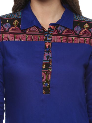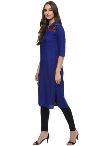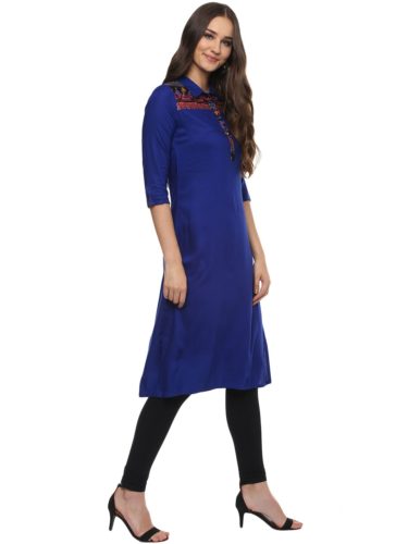 Evam Blue Solid Rayon Shirt Collar 3/4th Sleeve Long Kurta