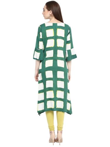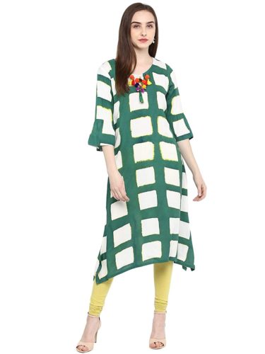 This Green colour A-line kurti, tailored in regular fit is made up of Rayon fabric suitable for various seasons and occasions. This kurti is sold at the most reasonable price to enhance customer satisfaction. We assure you this 3/4 Sleeve printed kurti with Round neck will surely fetch many compliments from your near and dear ones.