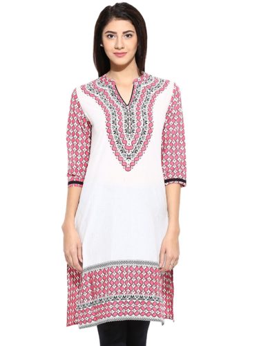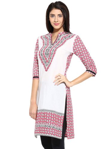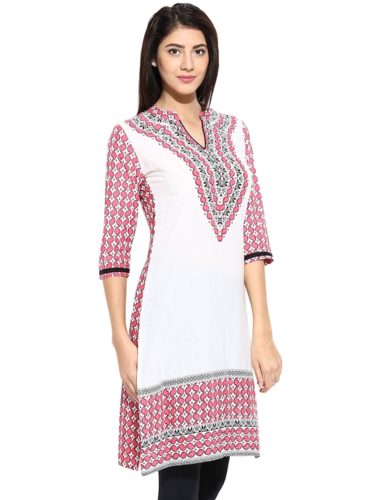 Evam Pink Straight Cotton Printed Mandarin Long Kurta.