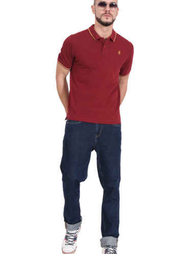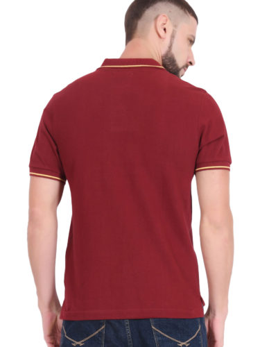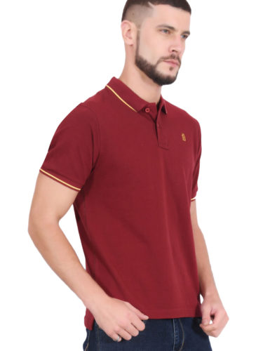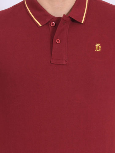 This plain Maroon Polo T shirt for men has a polo collar, short sleeves, logo embroidered on the front left side. It has a two button placket style with no pockets and has a Regular comfort fit. For a subtle styling, it has got a thin Yellow lining on its cuffs and collar.